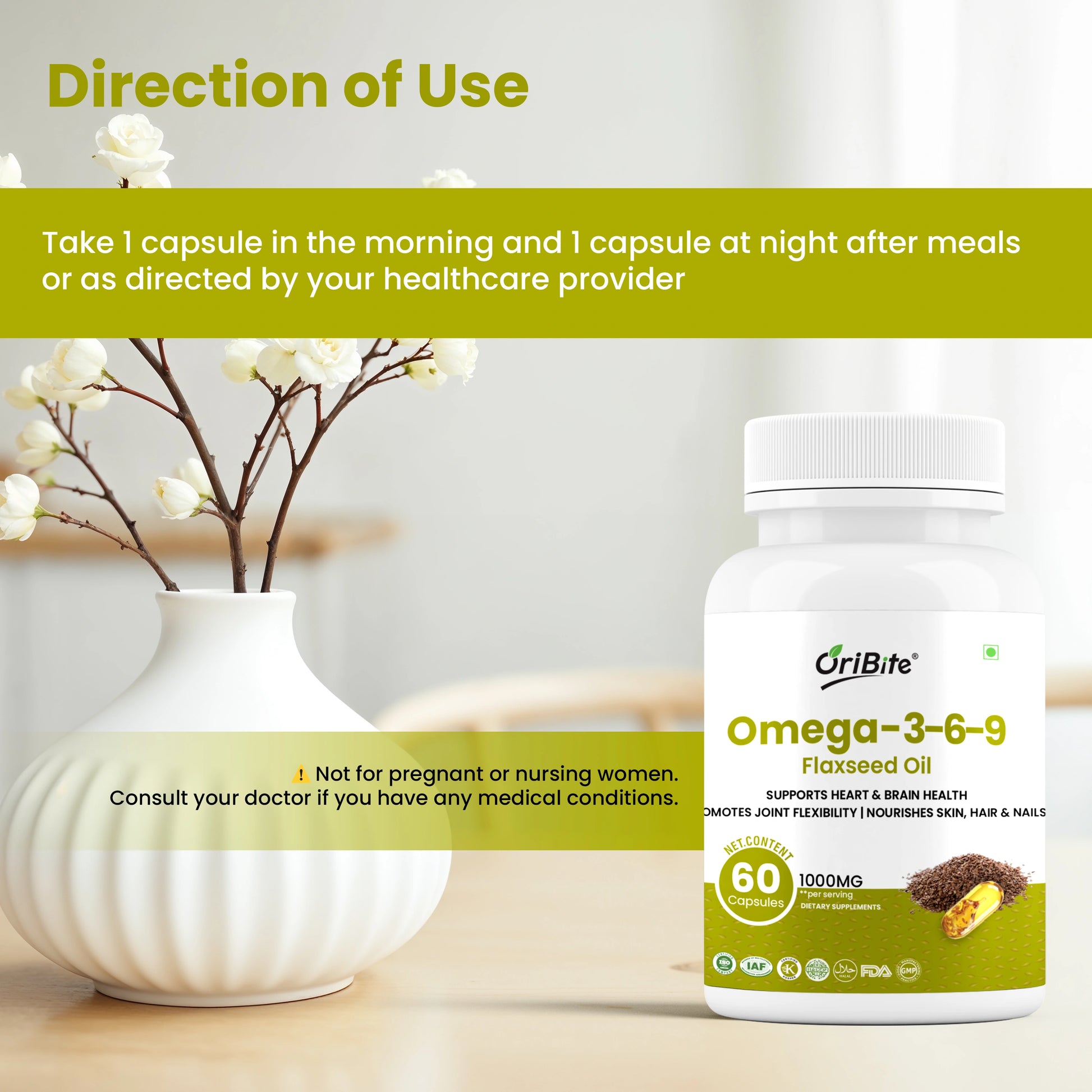 Oribite Omega 3-6-9 Flaxseed Oil 1000mg – Triple Omega Fatty Acids Supplement for Heart, Brain, Joint, Skin & Hair Health – 60 Capsules